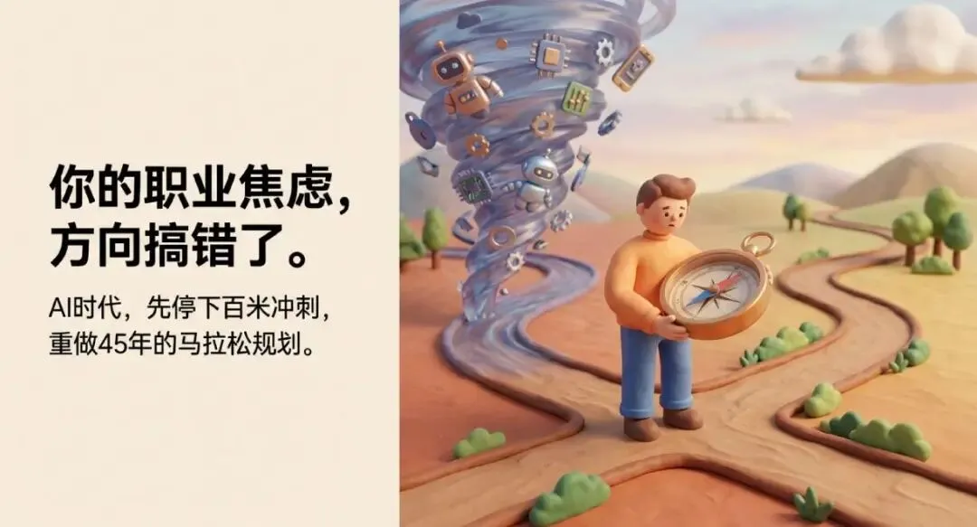 我朋友最近也陷进去了。她做室内设计,这一两年AI出图、生成方案的工具冒得很快,以前要跟甲方磨好几轮才能定下来的初稿,现在输几行提示词就能跑出一堆,她跟我说,站在那儿有种踩空的感觉。她问我有没有值得看的职业规划书,我把《远见》推给了她,顺手自己又翻了一遍。重读下来,我越来越觉得:很多人的焦虑本身没有问题,但焦虑的方向偏了。 一直盯着“怎么赶上这波AI”,却很少有人想过,怎么把接下来这45年的职业路走稳、走远。
