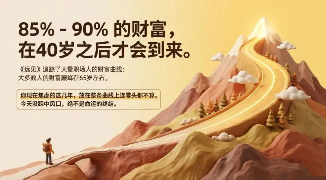 《远见》的作者费瑟斯通豪追踪了大量职场人的财富曲线,得出一个数字:人一生财富的85%至90%,集中在40岁之后才赚到,巅峰在65岁左右。