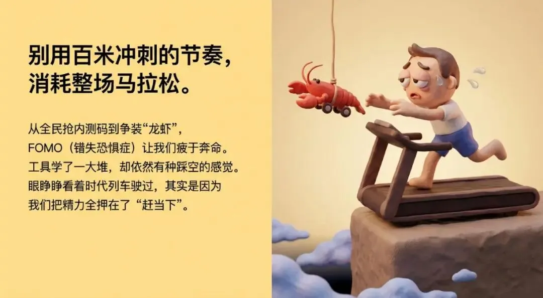 你现在焦虑的这几年,放在整条曲线上,连零头都不算。今天没装上龙虾、没踩中风口,大概率不是什么命运转折点。可偏偏很多人把全部精力押在了“赶当下”——哪个工具最火学哪个,哪条赛道最热冲哪条。马拉松还没跑几公里,已经在用百米冲刺的节奏消耗自己。