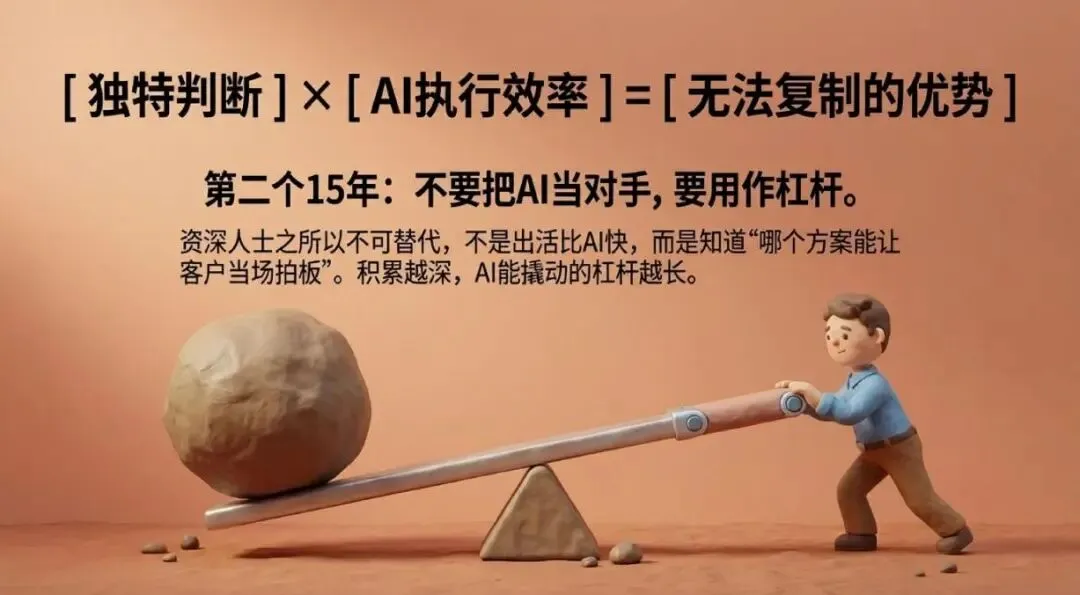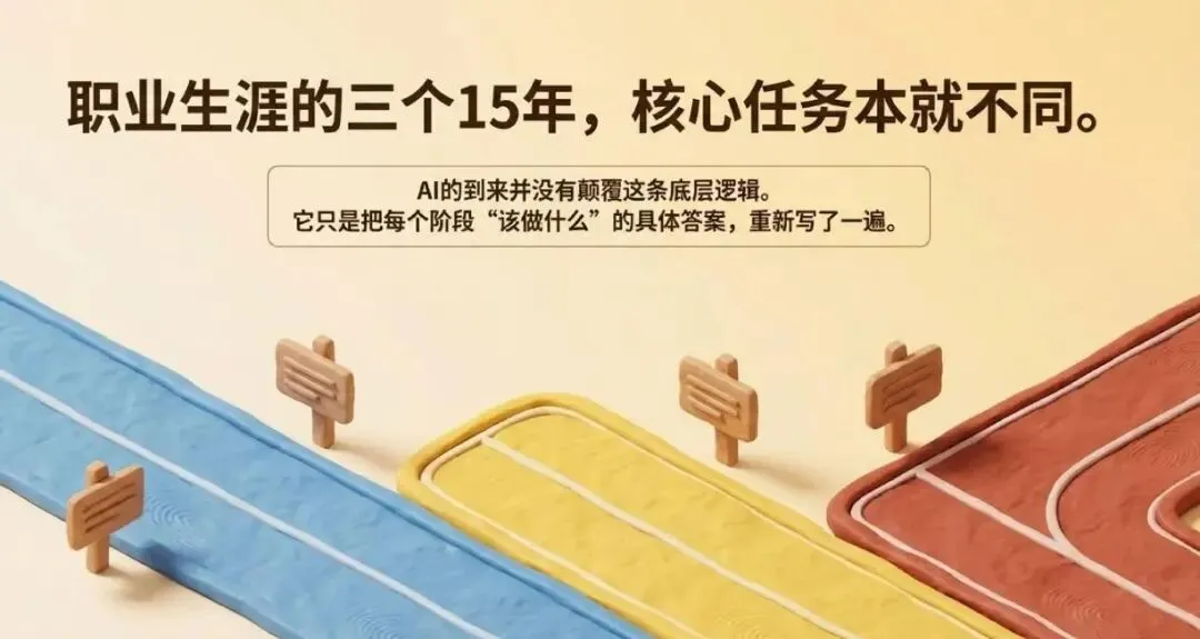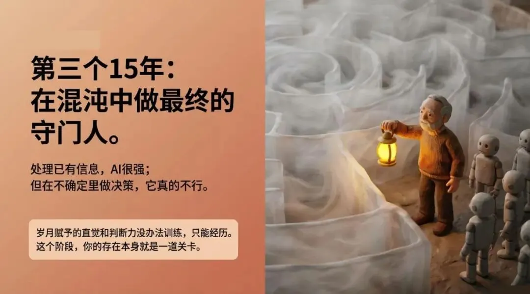 进入中段(15-30年),先把自己真正擅长的事摸清楚,再想AI能在多大程度上提速:提速空间越大,杠杆越长;要是AI压根不懂其中的弯弯绕,那恰恰说明这里是别人最难复制的地方。