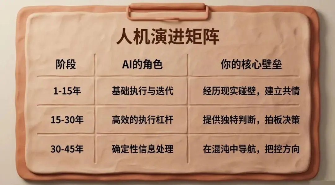 走到最后阶段(30-45年),核心动作是把多年的判断力变成可以输出的东西——做顾问也好、带团队也好、写成方法论也好,执行交给AI,自己守住那道判断的关口。