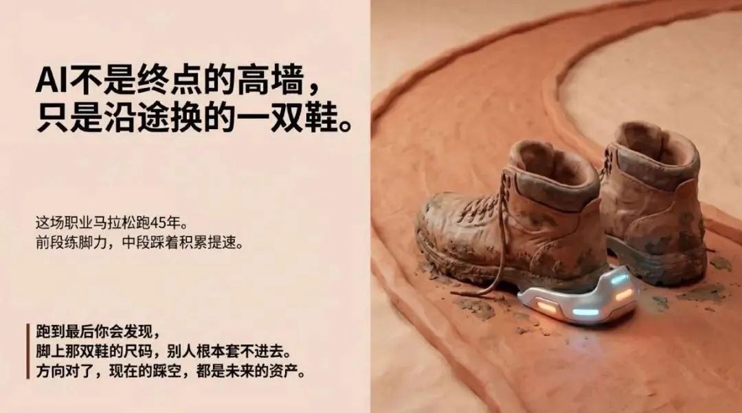 Image这场职业马拉松跑45年,AI的冲击不是在终点竖起一道墙,更像是沿途给不同赛段的选手换鞋——前段练的是脚力,中段踩着积累提速,跑到后段你会发现,脚上那双鞋的尺码,别人根本套不进去。