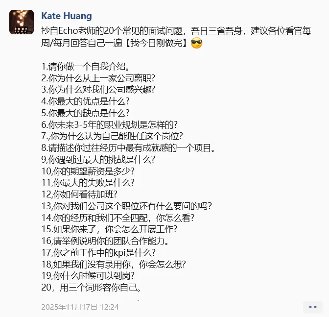 带着这份清晰认知梳理过往履历,你会自然联想到自身经历、特质与目标岗位的共性,将这些共性提炼出来,融入工作内容和项目经历,在日常工作流程基础上增添亮点,让简历更具针对性和说服力,大幅提高求职匹配成功率。另外,你还可以借鉴猎头行业培训师Echo姐的方法——我之前也在朋友圈分享过,通过相关问题自问自答,既能获取简历撰写灵感,也相当于提前演练了面试准备。(图片来自K姐的朋友圈截图)最后,K姐想对你说,简历是你职场的“名片”,承载着你的工作经历、专业能力与职业态度,直接决定你能否获得面试机会、匹配到心仪岗位。与其敷衍拼凑、照搬复制,不如静下心认真梳理,写出一份有灵魂、有亮点的简历——这不仅能让猎头高效帮你对接优质机会、抓住HR的注意力,更能让你在求职路上少走弯路,实现职场进阶,找到属于自己的合适平台。注:个人观点,仅供参考,未考虑周到之处,欢迎各位读者留言补充