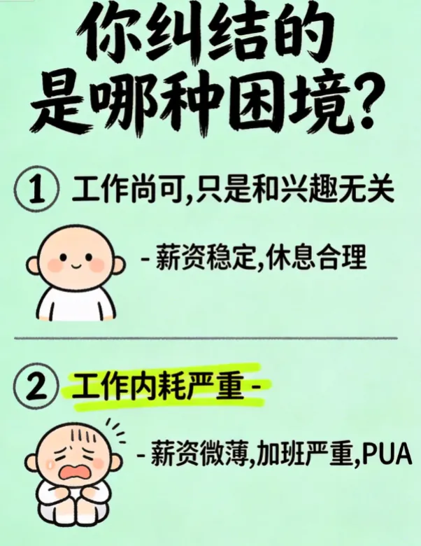 第二种困境:工作不仅和兴趣无关,还充满内耗——薪资微薄、加班严重、领导PUA、同事勾心斗角,每天上班都像上刑,哪怕这份工作能勉强糊口,也让你身心俱疲,连坚持下去的勇气都没有。这时候,你渴望的不是“兴趣变现”,而是逃离当前的困境。