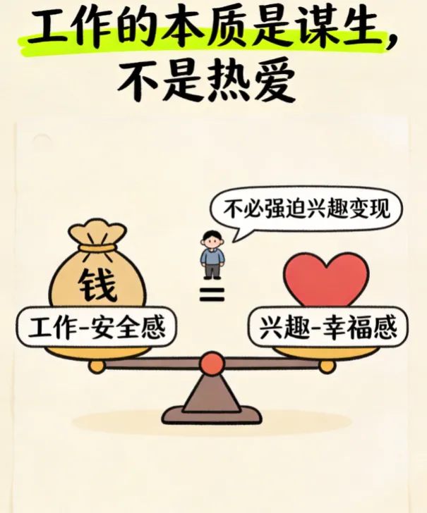 不必强迫自己“兴趣变现”,也不必因为“工作和兴趣不成正比”而焦虑。接受“工作是谋生,兴趣是热爱”,才能跳出内耗,找到属于自己的平衡。