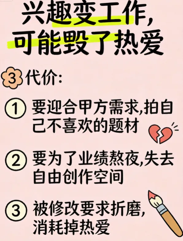 到最后,你会发现,曾经热爱的事情,因为被赋予了“谋生”的压力,反而变得枯燥、压抑,甚至会彻底消耗掉你对这份兴趣的热爱。