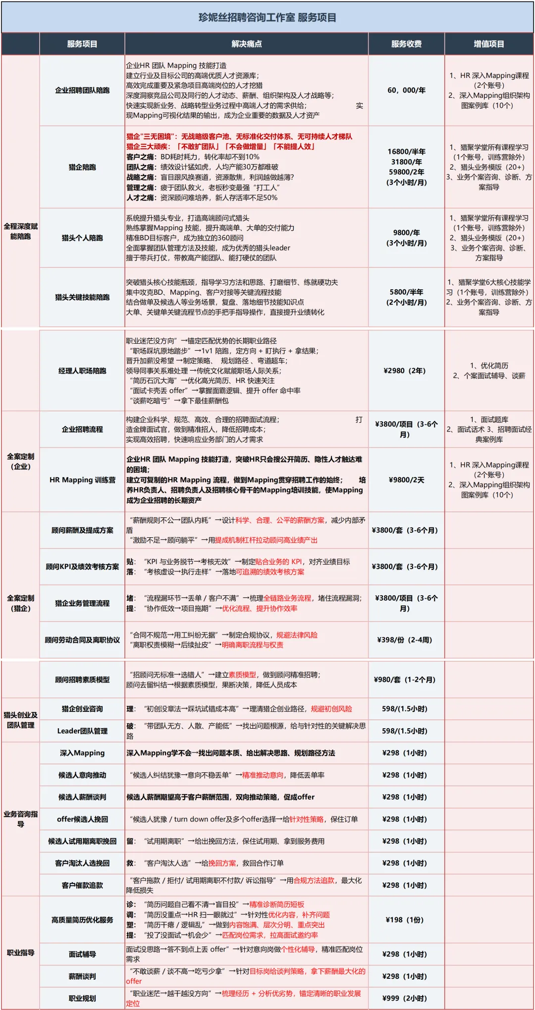 鉴于过往的一线实战经验,应众多读者粉丝的需求,成立了珍妮丝招聘咨询工作室,下面是工作室的服务内容。