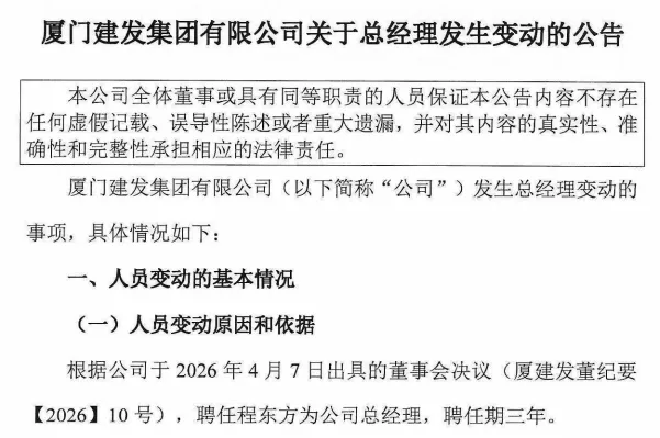 2026年4月7日,厦门建发集团的一纸董事会决议,让一个男人的名字开始在福建商业圈刷屏。程东方。他被聘任为建发集团总经理,任期三年。同一天,他辞去了建发股份总经理的职务。这个辞职不是退场,是往上走了一大步——从管一个上市公司,到管整个建发系商业帝国。
