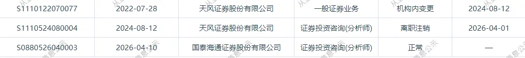 近日,证券从业系统显示,林毓鑫4月1日从天风证券离任,4月10日正式加入国泰海通证券。