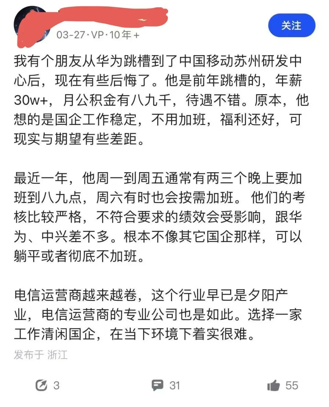 今天刷手机时,无意间在脉脉上看到一个帖子,讲的是一个从华为跳槽到中国移动苏州研发中心的朋友,如今却有些后悔了。这位朋友前年跳槽时,年薪30万加,月公积金近九千,待遇在当时看来相当不错。他原本以为国企工作稳定、不加班、福利好,但现实却与期望相差甚远。最近一年,他每周有两三个晚上要加班到八九点,周六也时常要“按需加班”,考核严格,绩效压力大,跟华为、中兴的节奏差不多,根本不像其他国企那样可以“躺平”。
