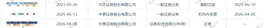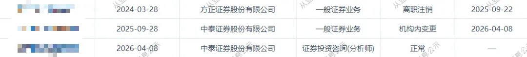2、韩乐,25年9月22日从方正证券离任,25年9月28日加入中泰证券,26年4月8日晋升为中泰证券分析师。