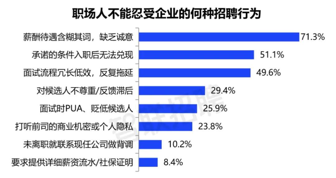 数据显示,超七成求职者难以接受企业“谈薪不透明”。而“承诺的条件入职后无法兑现”也位列求职者最不能接受行为第二位。